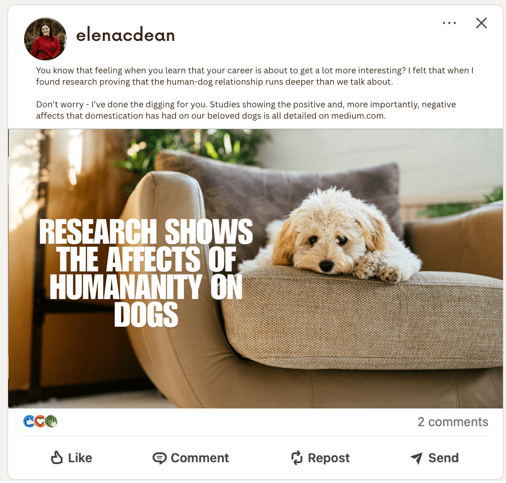 In preparation for releasing my long-form writing piece about the affects of domestication on dogs, I’ve been tasked with drafting attention-catching social media promotions.
